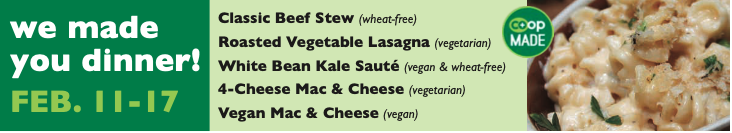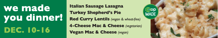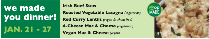 During off hours, you can find delicious ready-made sandwiches, salads, soups and juice bar beverages in the grab 'n' go case. Be sure to also check out the week's We Made You Dinner, always fresh and ready to heat and eat or freeze for later.
