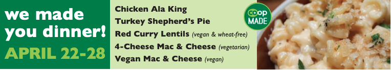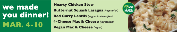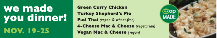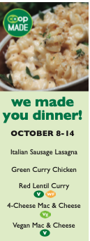 During off hours, you can find delicious ready-made sandwiches, salads, soups and juice bar beverages in the grab 'n' go case. Be sure to also check out the week's We Made You Dinner, always fresh and ready to heat and eat or freeze for later.