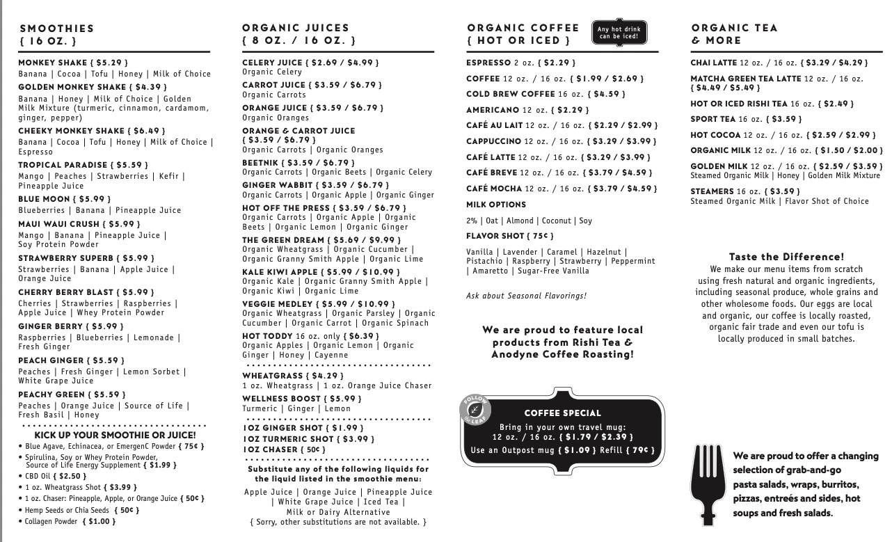We focus on fresh organic, local and seasonal ingredients and believe that made-from-scratch foods simply taste better. You won't find artificial colors, flavorings or preservatives either! Be sure to check out our vegetarian, vegan or gluten-free specialties.