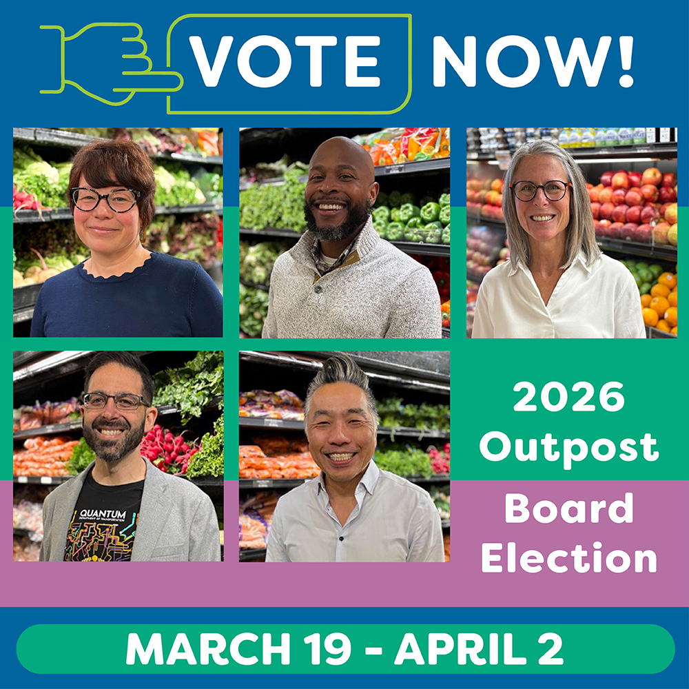 Your Board of Directors steers the path of Outpost toward the future. The board is made up of nine owners just like you, chosen by annual election. This is where the true power of co-op ownership comes into play. Unlike corporations, co-op board elections are democratically run — owners all have an equal vote. Board members serve staggered 3-year terms.