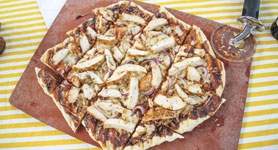 2. Brush the Flatzza with olive oil and top with the chicken and BBQ sauce mixture from the skillet, any additional BBQ sauce (if desired), sautéed onions and peppers, and shredded smoked Gouda cheese.