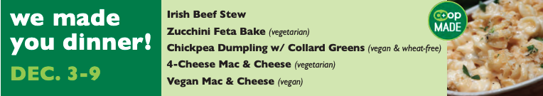 During off hours, you can find delicious ready-made sandwiches, salads, soups and juice bar beverages in the grab 'n' go case. Be sure to also check out the week's We Made You Dinner, always fresh and ready to heat and eat or freeze for later.