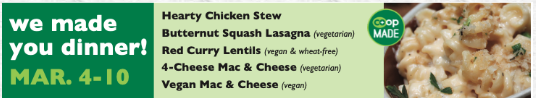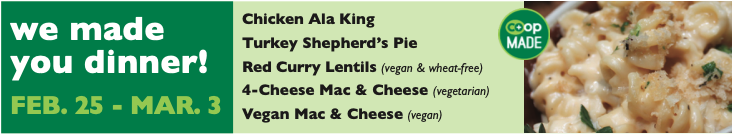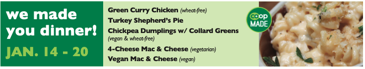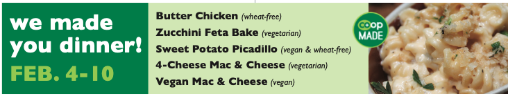 During off hours, you can find delicious ready-made sandwiches, salads, soups and juice bar beverages in the grab 'n' go case. Be sure to also check out the week's We Made You Dinner, always fresh and ready to heat and eat or freeze for later.